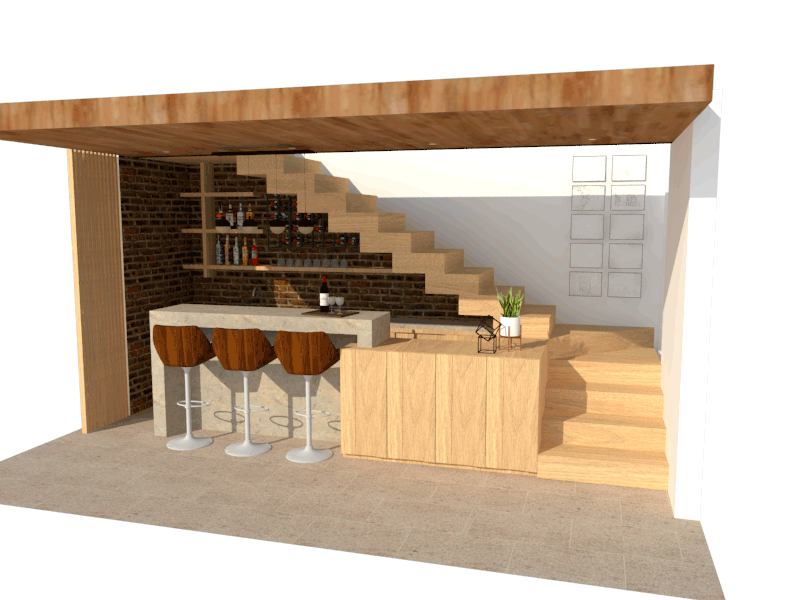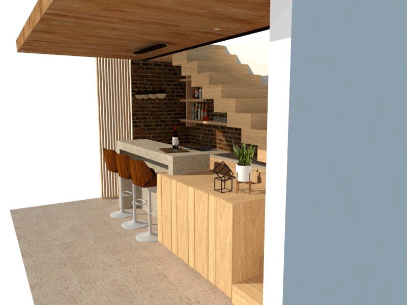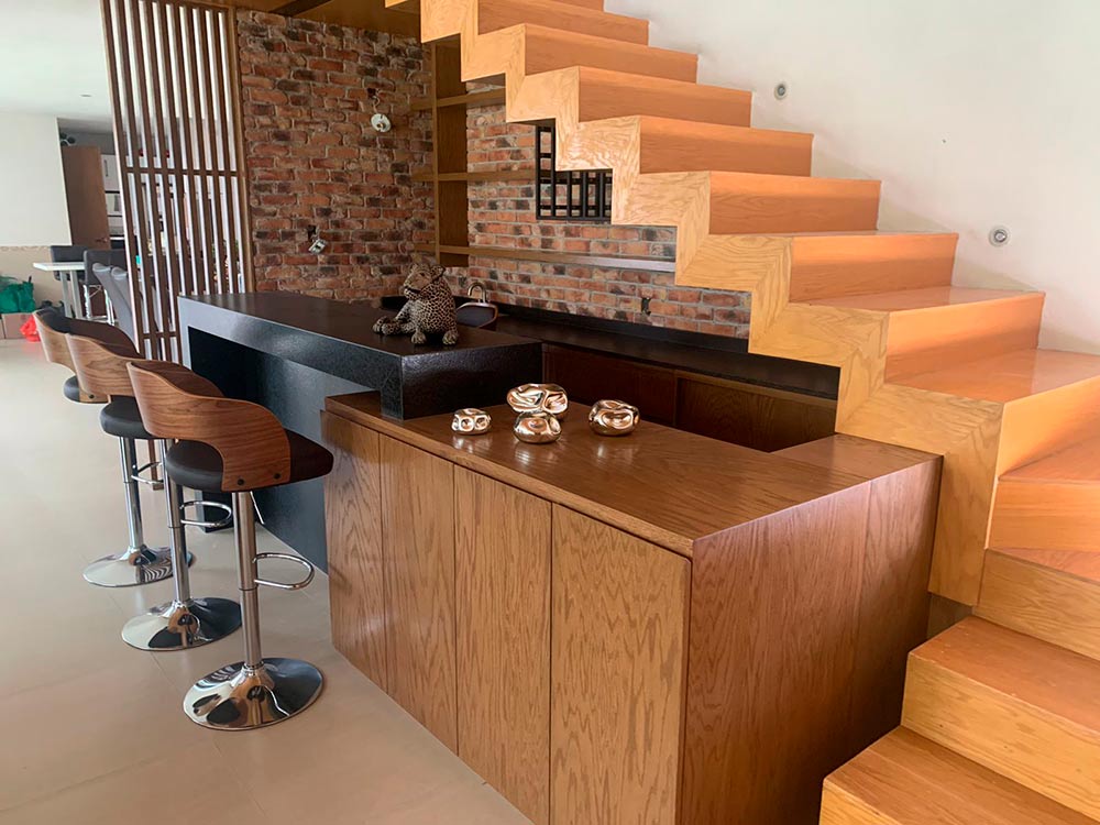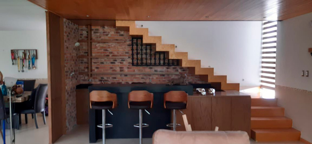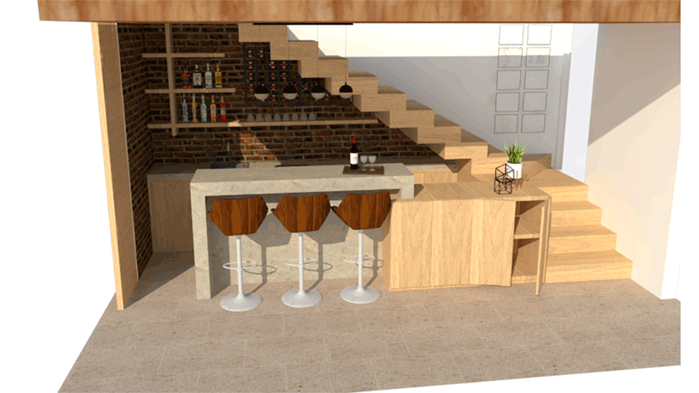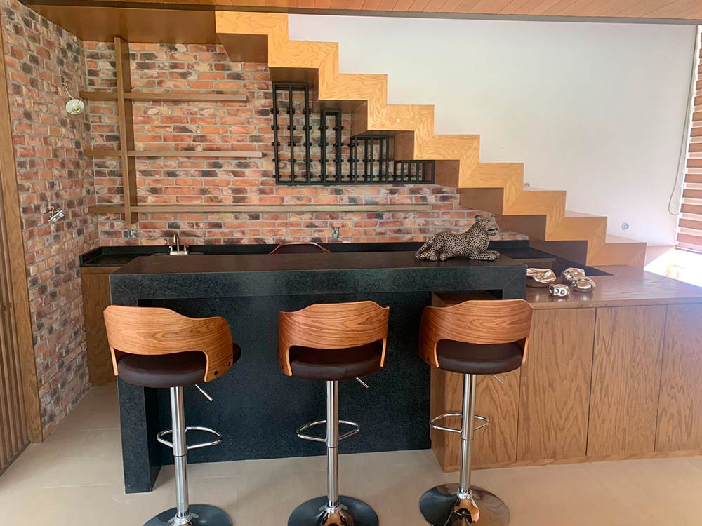 Aprovechando el espacio muerto bajo la escalera, pensamos en un bar, espacio de recreación con amigos, dando amplitud al área social de la casa, además de dar lugar de almacenamiento y exhibición de piezas importantes para la familia.