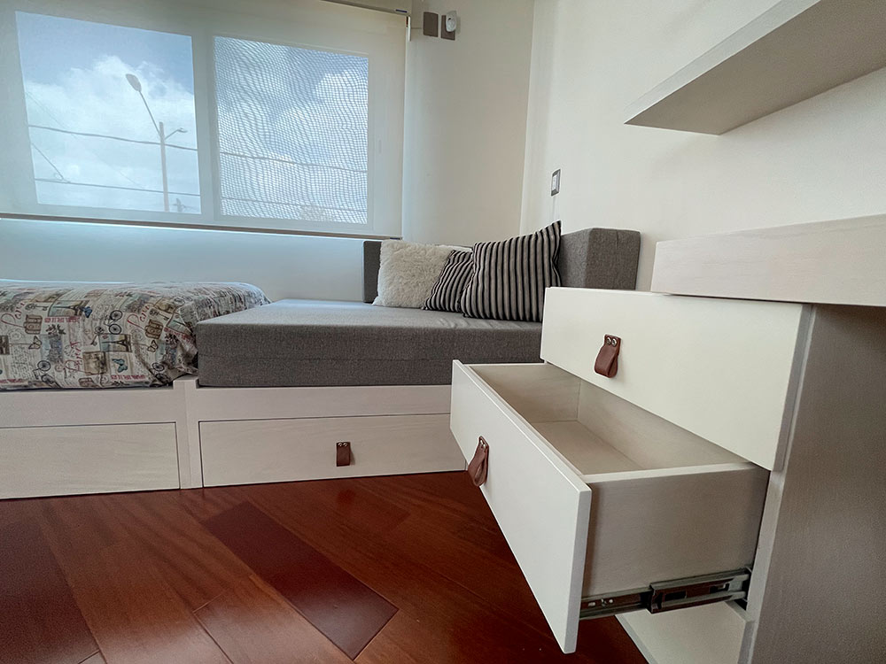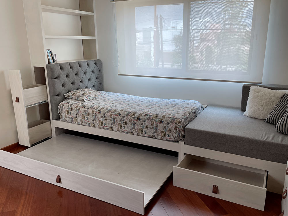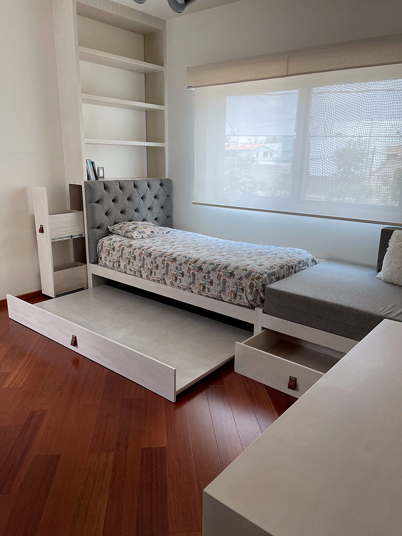 Se resolvió con una cama nido para las pijamadas, una silla colgante para dar un estilo relajado y un asiento extra como extensión de su cama, dejando espacio suficiente para bailar y ejercitarse.